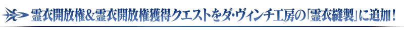 2018年に開催された期間限定イベント「サーヴァント・サマー・フェスティバル!」で登場した「★5(SSR)巌窟王 エドモン・ダンテス」の霊衣「モンテ・クリストセレクション」開放権、2020年に開催された期間限定「Fate/Grand Order ~5th Anniversary~」で登場した「★5(SSR)アルジュナ」の霊衣「授かりし旅装」開放権獲得クエストをダ・ヴィンチ工房の「霊衣縫製」に追加!