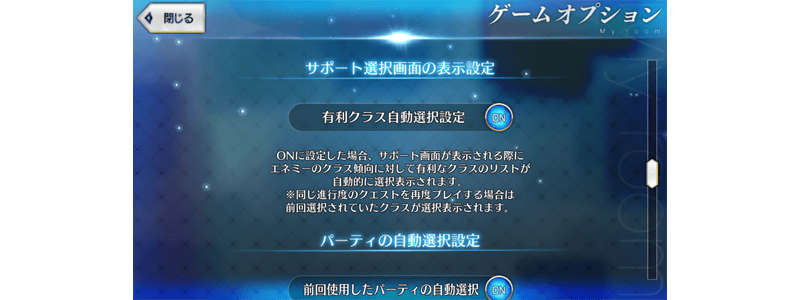 ※マイルームの「ゲームオプション」にて、本機能の設定をOFFにすることも可能です。OFFにした場合、前回出撃時に選択されたクラスが選択表示されます。