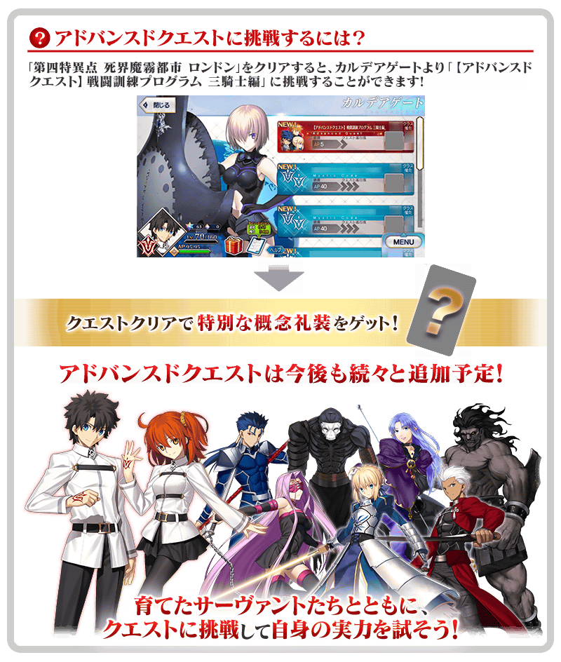 育成したサーヴァントとともに「アドバンスドクエスト」に挑戦し、自身の実力を試しましょう!