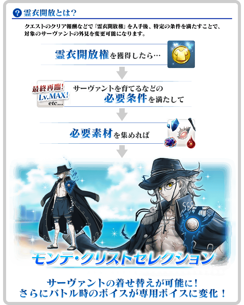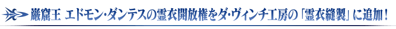 ※「★5(SSR)巌窟王 エドモン・ダンテス」を未所持の場合、霊衣開放権の入手はできますが、霊衣開放はおこなえませんのでご注意ください。