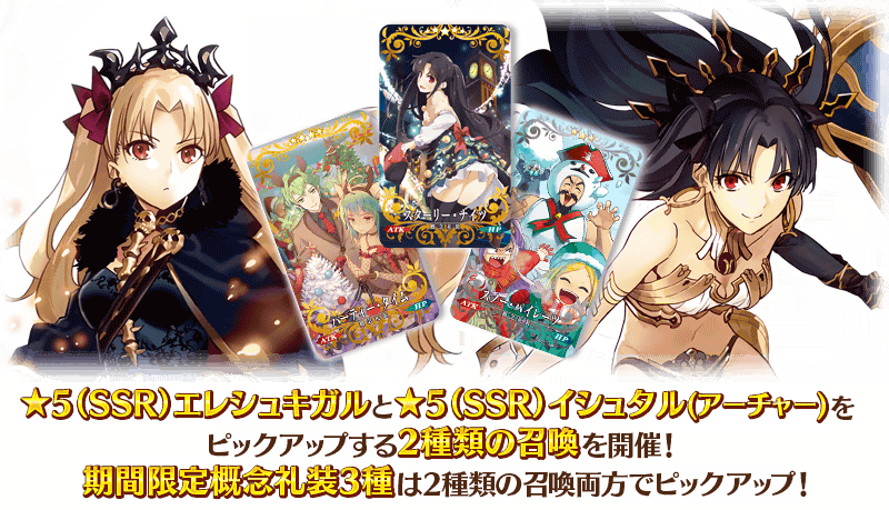 「レアプリズムを交換」の「メイン・インタールード 冥界のメリークリスマス」を、メインクエスト第1部 第七特異点クリアで無料開放した記念として、「★5(SSR)エレシュキガル」「★5(SSR)イシュタル(アーチャー)」と、2017年の「クリスマス2017ピックアップ召喚(日替り)」で登場した期間限定概念礼装3種をピックアップする2種類の召喚を開催いたします!