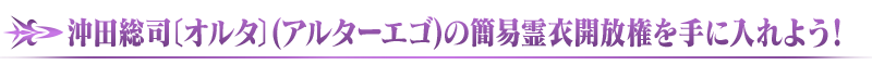 ※「★5(SSR)沖田総司〔オルタ〕(アルターエゴ)」を未所持の場合、霊衣開放権は入手できますが、霊衣開放はおこなえませんのでご注意ください。