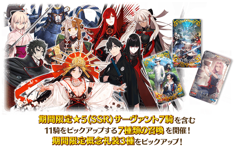 11回召喚では★4(SR)以上1枚確定と★3(R)以上のサーヴァント1騎確定! ※★4(SR)以上確定にはサーヴァントと概念礼装が含まれます。 ※本ページの画像はすべて開発中のものです。実際の画像とは異なる場合があります。