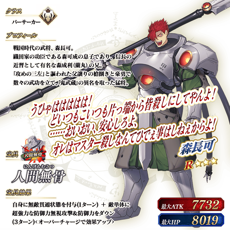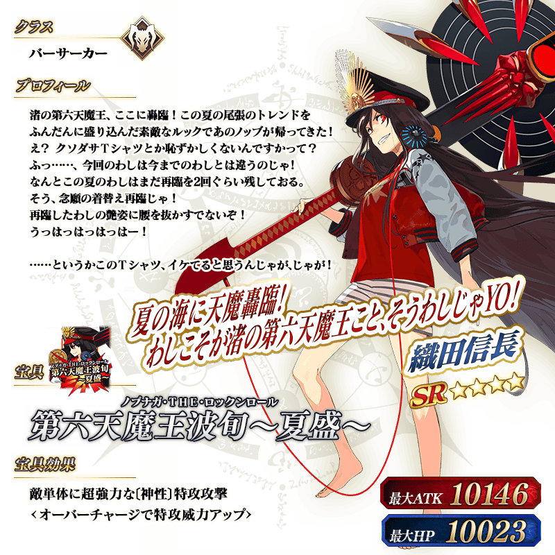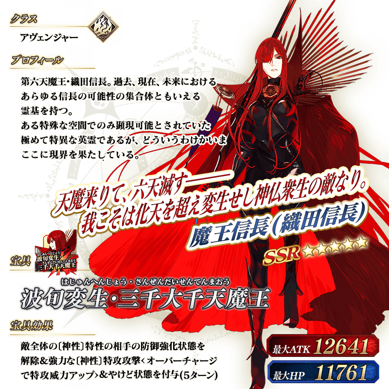 ※「★5(SSR)魔王信長(織田信長)」は「★5(SSR)織田信長」を霊基再臨第3段階にすることで名称が「★5(SSR)魔王信長」に変化します。