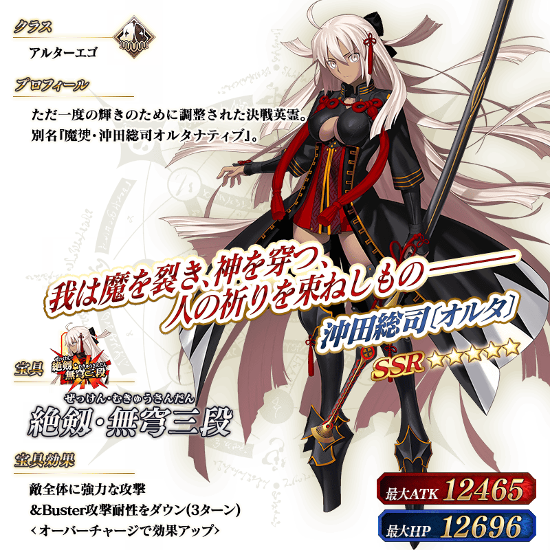 ※上記の「★5(SSR)沖田総司〔オルタ〕(アルターエゴ)」のイラストは霊基再臨第2段階のものです。