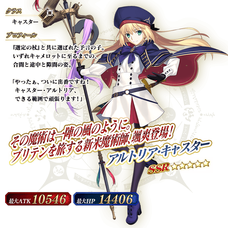 ※上記の「★5(SSR)アルトリア・キャスター」のイラストは霊基再臨第2段階のものです。