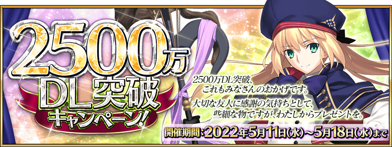2500万DL突破を記念して、期間限定サーヴァント「★5(SSR)アルトリア・キャスター」を含む4騎のサーヴァントと、2020年の「5周年記念ピックアップ召喚(日替り)」で登場した期間限定概念礼装3種をピックアップ!
