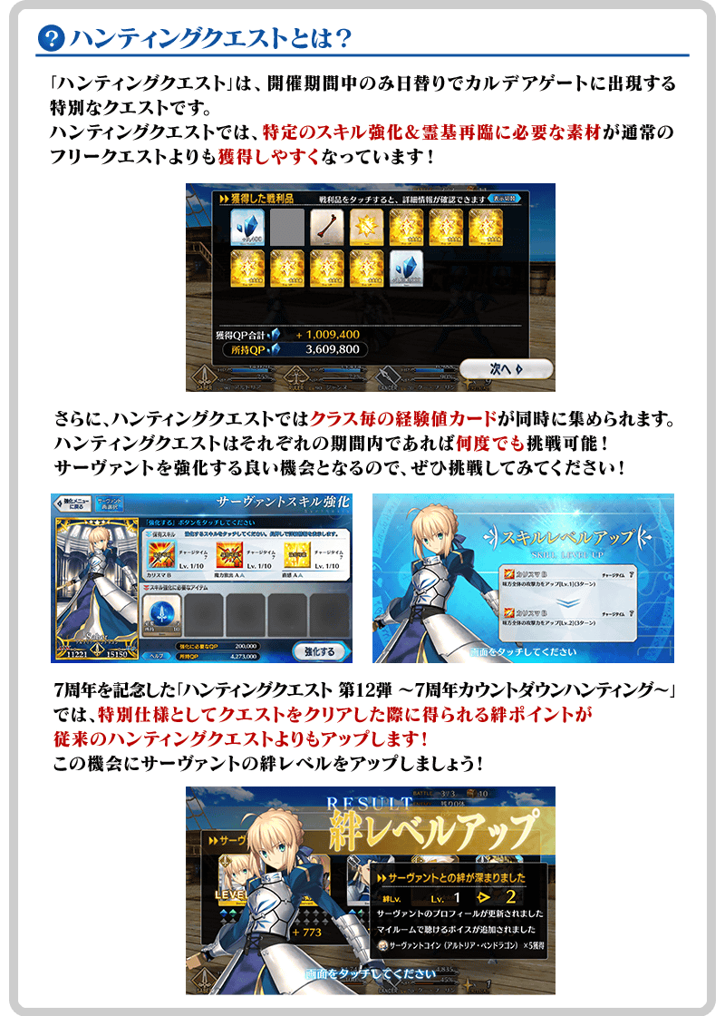 「ハンティングクエスト 第12弾 ~7周年カウントダウンハンティング~」では、クエストをクリアした際に得られる絆ポイントが、従来のハンティングクエストよりもアップします! 7周年を記念した、今回のハンティングクエストの特別仕様となりますので、この機会にサーヴァントの絆レベルをアップしましょう!