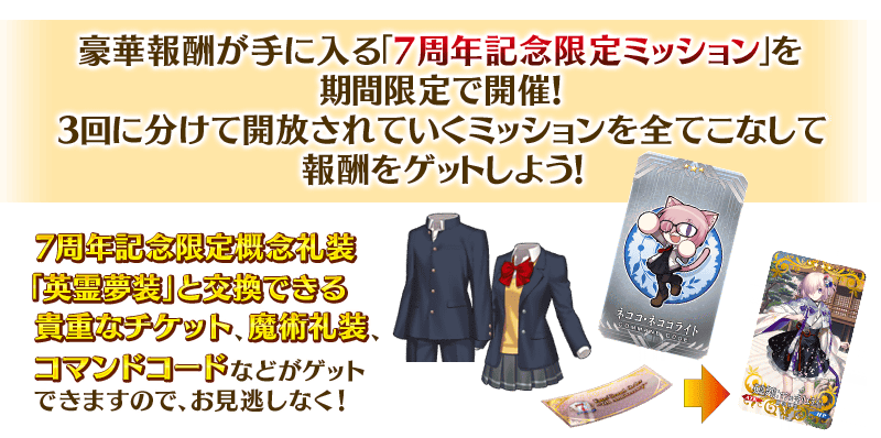 「7周年記念限定ミッション」の達成報酬として、魔術礼装「総耶高校学生服」とコマンドコード「★3(R)ネココ・ネココライト」が登場!