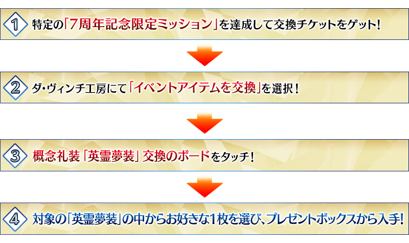 交換対象となる期間限定概念礼装「英霊夢装」の種類は、メインクエストのクリア状況によって増えていきます。