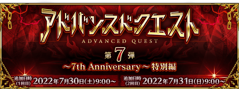 2022年7月30日(土) 9:00から、自分の育てたサーヴァントのみで挑む腕試し用のクエスト「アドバンスドクエスト」の第7弾がカルデアゲート内に恒常的に追加されます。