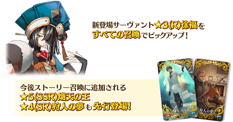 また、すべての召喚で新登場サーヴァント「★3(R)徐福」、期間限定概念礼装3種をピックアップするほか、今後ストーリー召喚に追加される新規概念礼装2種も先行登場いたします!