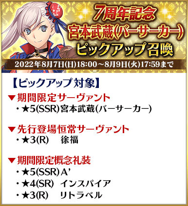◆「7周年記念限定サーヴァント日替りピックアップ召喚」期間◆