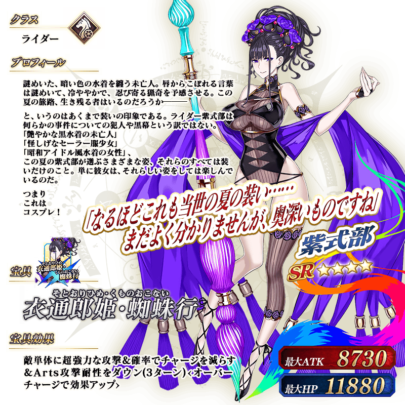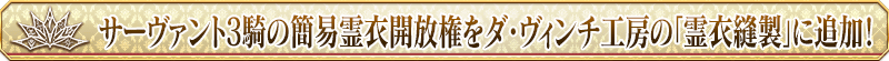 過去に登場した、「★5(SSR)両儀式(セイバー)」の簡易霊衣「首切りバニー(第一再臨)」「首切りバニー(第二再臨)」「首切りバニー(第三再臨)」開放権、「★5(SSR)謎のヒロインX」の簡易霊衣「謎のヒロインZ」開放権、「★5(SSR)宮本武蔵(バーサーカー)」の簡易霊衣「武蔵ちゃんの夏モード」開放権をダ・ヴィンチ工房の「霊衣縫製」に追加!
