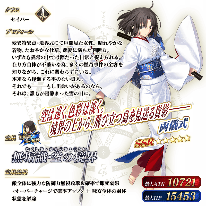 ※「★5(SSR)両儀式(セイバー)」「★5(SSR)謎のヒロインX」「★5(SSR)宮本武蔵(バーサーカー)」を未所持の場合、霊衣開放権の入手はできますが、霊衣開放はおこなえませんのでご注意ください。