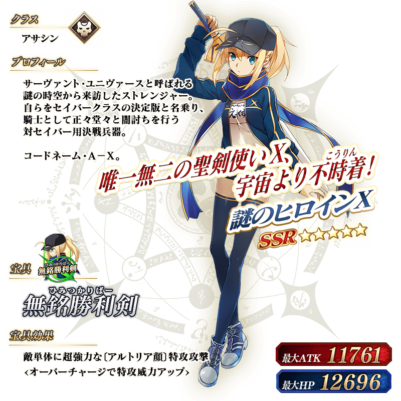 ※上記の「★5(SSR)謎のヒロインX」のイラストは霊基再臨第2段階のものです。