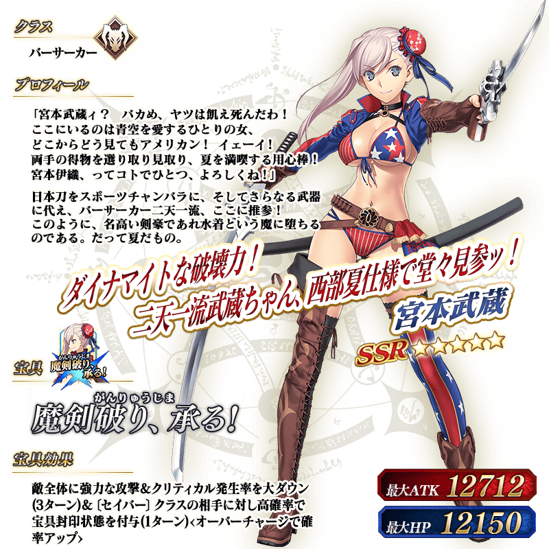 ※上記の「★5(SSR)宮本武蔵(バーサーカー)」のイラストは霊基再臨第2段階のものです。