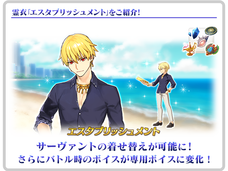 2018年に開催された期間限定イベント「サーヴァント・サマー・フェスティバル!」で登場した「★4(SR)ギルガメッシュ(キャスター)」の霊衣「エスタブリッシュメント」開放権をダ・ヴィンチ工房の「霊衣縫製」に追加!