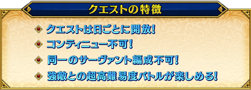 ※同名のサーヴァントでもレアリティかクラスが異なる場合や、名前に〔オルタ〕などと付く場合は編成可能です。 ※エキシビションクエストはクリア後も消滅せず、何度でも挑戦することが可能です。 ※クエストクリア報酬、戦利品、マスターEXP、魔術礼装EXP、絆ポイントを獲得できるのは初回クリア時のみです。