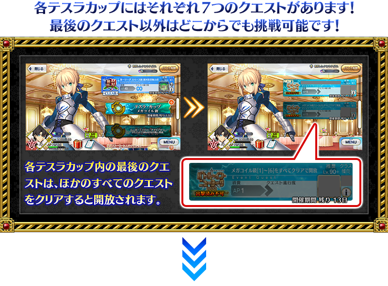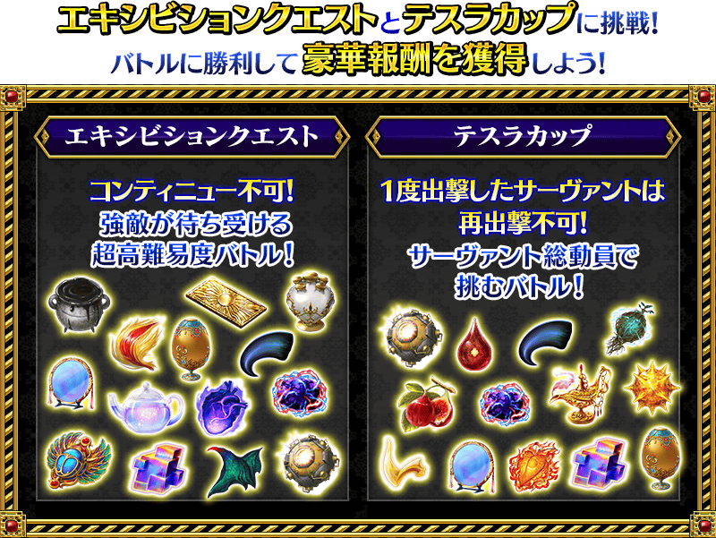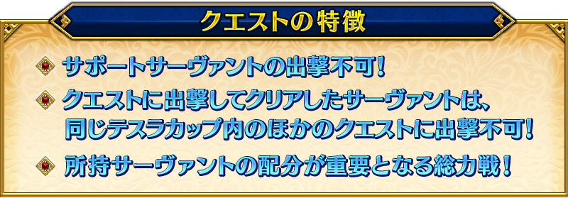 ※テスラカップには「テスラカップ メガコイル級」と「テスラカップ ギガコイル級」があり、「テスラカップ ギガコイル級」は後日開放予定となります。 ※同一のサーヴァントを「テスラカップ メガコイル級」と「テスラカップ ギガコイル級」にそれぞれ出撃させることができます。 ※クエストに出撃したサーヴァントは、クエストクリア時のみ同じテスラカップ内のほかのクエストに出撃できなくなり、敗北または撤退した場合は出撃できます。 ※同じサーヴァントを複数騎所持している場合は、クエストクリア時に出撃していない同サーヴァントも同じテスラカップ内のほかのクエストに出撃できなくなります。 ※クエストクリア報酬、戦利品、マスターEXP、魔術礼装EXP、絆ポイントを獲得できるのは初回クリア時のみです。 ※各クエストのクリア報酬は、過去の登場時とは異なる場合がございますのでご注意ください。