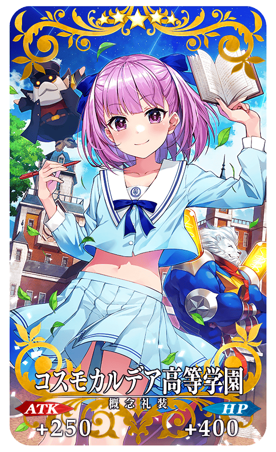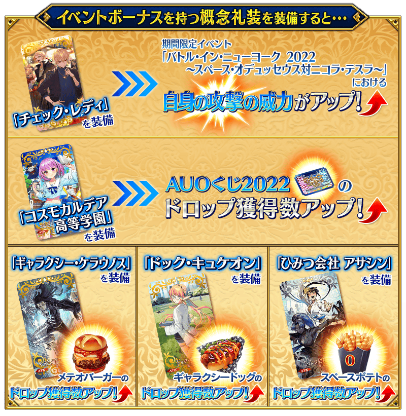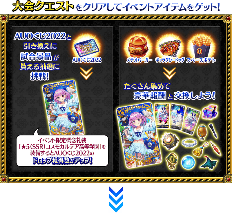 また、イベントアイテム交換で入手できるイベント限定概念礼装「★5(SSR)コスモカルデア高等学園」を装備することでイベントアイテム「AUOくじ2022」のドロップ獲得数がアップ!
