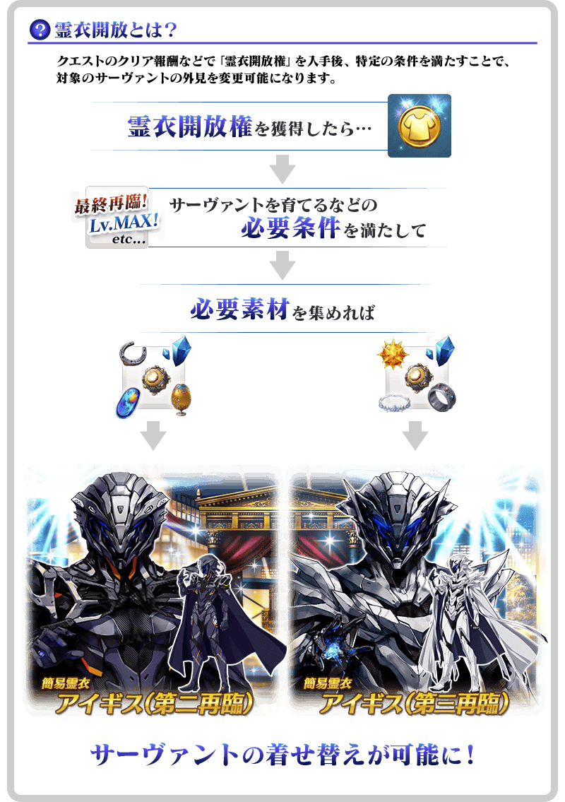 ※「霊衣開放」後は自動でバトルキャラやアイコンが切り替わります。「霊衣開放」前の状態に戻したい場合や、他の再臨段階に変更したい場合は、サーヴァント詳細画面より変更することができます。 ※「霊衣開放」をおこなってもクラスやパラメータなどに変化はありません。