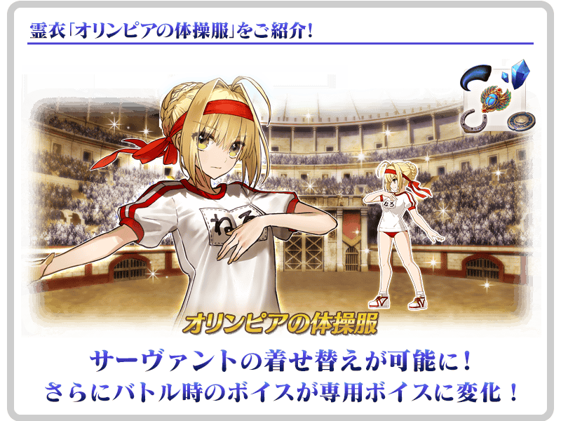ダ・ヴィンチ工房の「霊衣縫製」にて交換できる「★4(SR)ネロ・クラウディウス(セイバー)」の霊衣「オリンピアの体操服」開放権が、メインクエスト第1部 第二特異点をクリアすることで無料で交換できるようになりました!