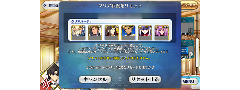 いろいろな編成を試すなかで、出撃済みのサーヴァントを別のクエストに出撃させたくなったときなどにクリア状況のリセットをご活用ください。