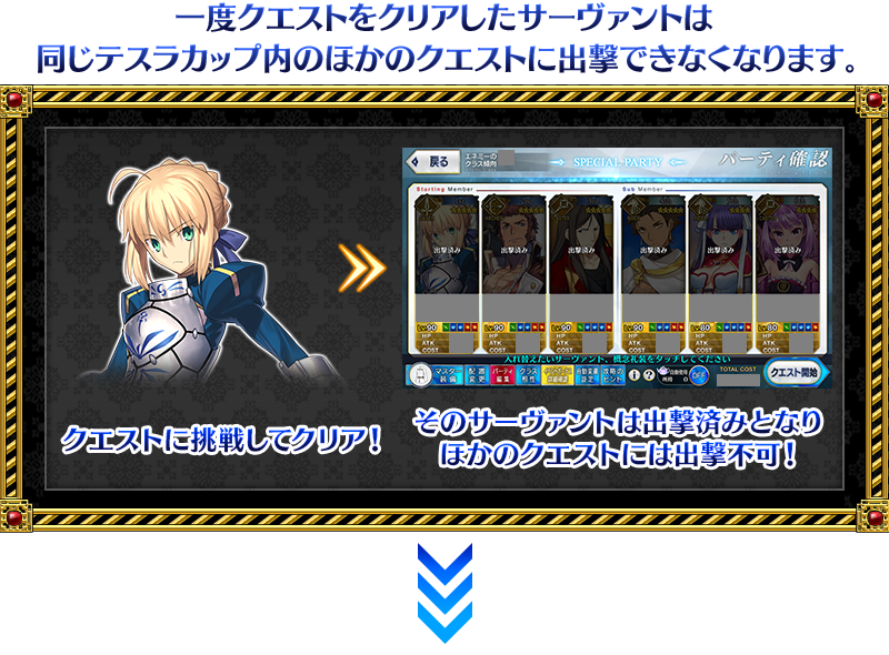 また、そのクエストをクリアして出撃済みになっているサーヴァントを再度出撃させることが可能となります。