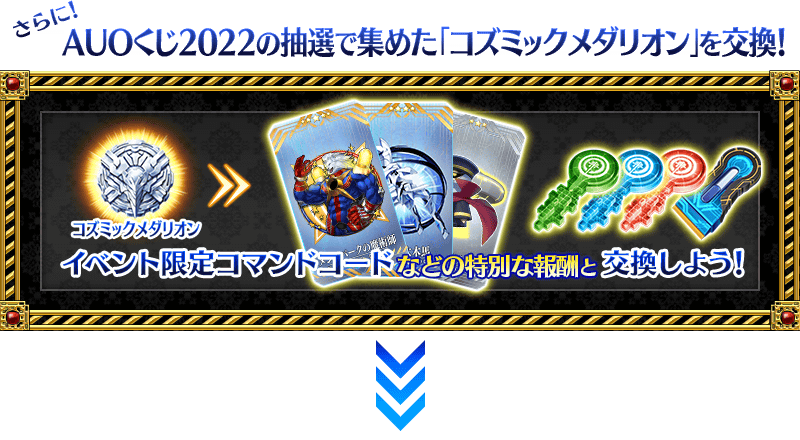 ※試合景品抽選の1回目~10回目では、「当たり」を引くことで「試合景品を更新」が表示されます。 ※11回目以降は、「試合景品を更新」は表示されず、すべての試合景品がなくなった時に自動的に次のラインナップに切り替わります。 ※11回目以降では、「当たり」および「黄金の果実」「白銀の果実」は更新されません。 ※試合景品にある「コズミックメダリオン」は、集めることでイベント限定コマンドコードなど特別な報酬と交換できます。 ※交換期間終了後「AUOくじ2022」は消滅します。