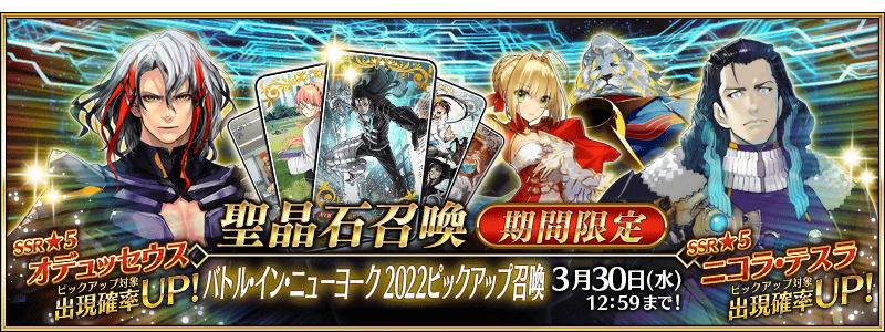 ※「★5(SSR)オデュッセウス」の霊衣開放権は、期間限定イベント「バトル・イン・ニューヨーク 2022 ~スペース・オデュッセウス対ニコラ・テスラ~」のイベントアイテム交換期間のみ入手可能です。