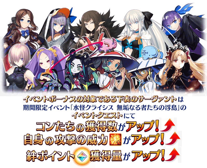本イベントの期間中、下表のサーヴァントはイベントクエストにおける「コンたちの獲得数がアップ」と 「自身の攻撃の威力がアップ」と「絆ポイント獲得量がアップ」のボーナスが得られます!