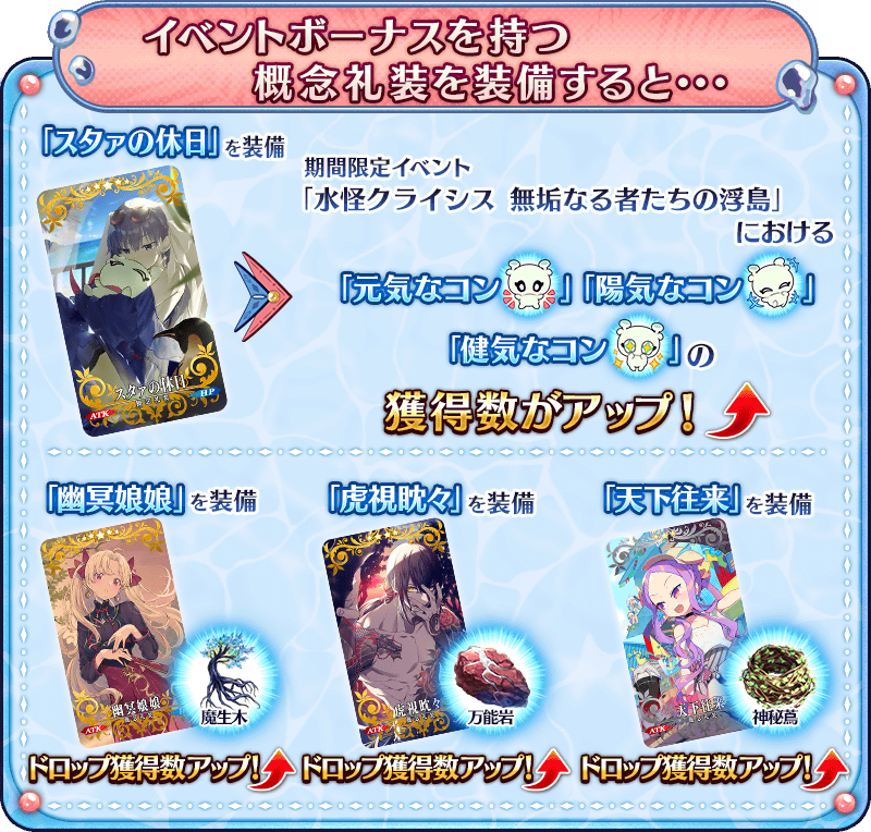 イベントアイテム交換で入手できるイベント限定概念礼装「★5(SSR)スタァの休日」を装備すると、期間限定イベント「水怪クライシス 無垢なる者たちの浮島」における「元気なコン」「陽気なコン」「健気なコン」の獲得数がアップします。