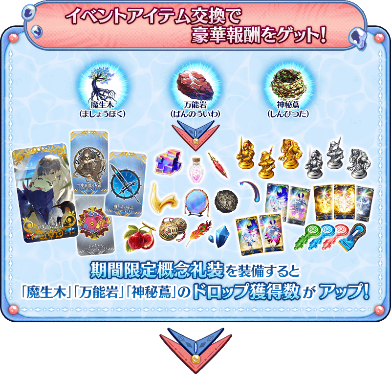 【イベント限定概念礼装】 【イベント報酬コマンドコード】 【スキル強化&霊基再臨素材】 【霊基再臨素材】 【その他アイテム】 |
