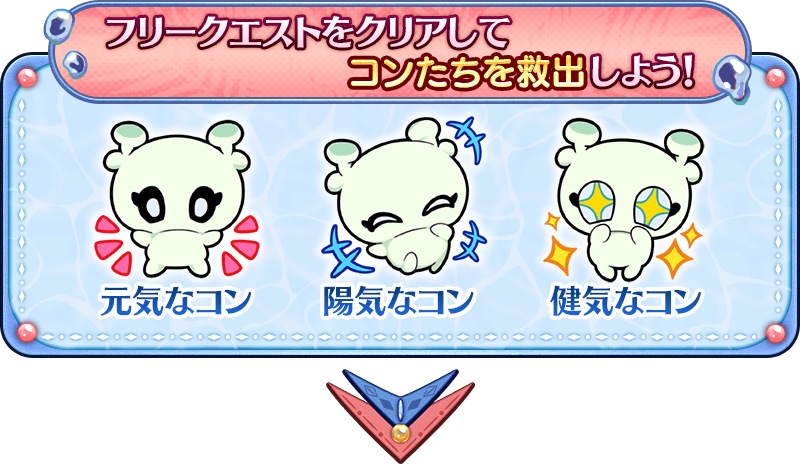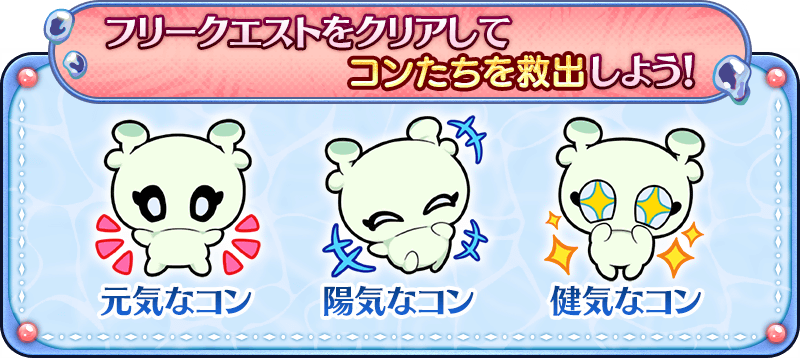 本イベントでは、ストーリーを楽しめるメインクエストが日ごとに開放されるほか、メインクエストをクリアするとフリークエストが開放され、イベントアイテムを集められるだけでなくコンたちを救出することができます。