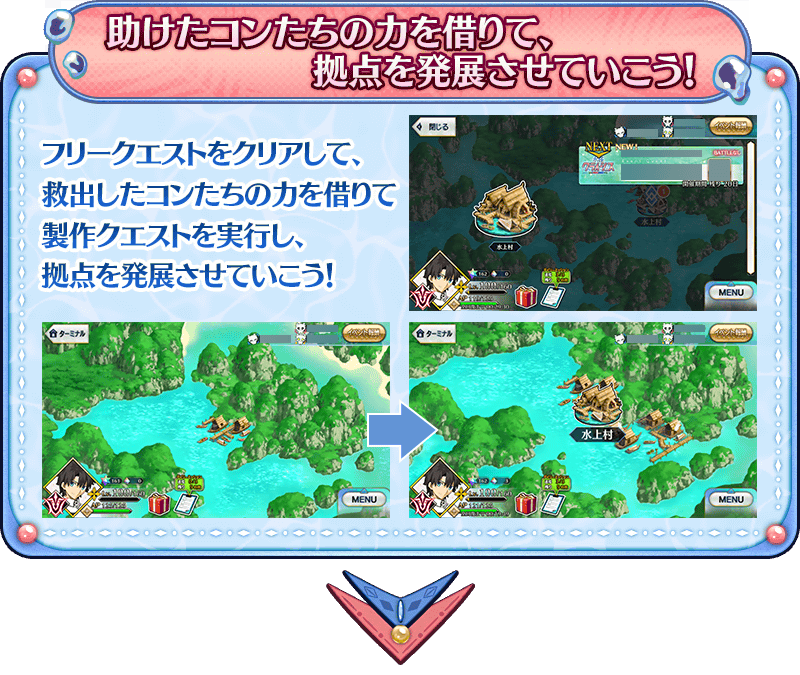 フリークエストをクリアすることで救出できる「元気なコン」「陽気なコン」「健気なコン」たちに協力してもらうことで、拠点の発展に必要なさまざまなものを製作することができます。