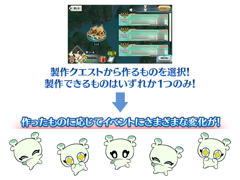 製作クエストでは何を作成したかによって、その後のアドベンチャーパートの一部の内容やイベントマップなどが変化していきます。
