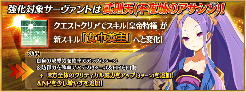 「★4(SR)武則天(不夜城のアサシン)」が強化される特別なクエスト「サーヴァント強化クエスト」が、カルデアゲートに恒常的に追加されました。