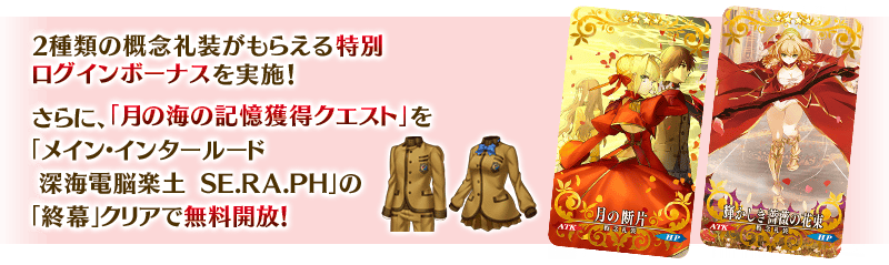 ※期間内にログインできなかった場合、キャンペーン限定概念礼装は入手不可となりますのでご注意ください。 ※期間内に受け取り条件を満たせなかった場合においても、キャンペーン限定概念礼装は入手不可となりますのでご注意ください。 ※期間内の初回ログイン時にキャンペーン限定概念礼装を2枚入手できます。