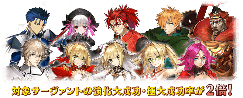 下記の期間中、特定のサーヴァントの強化をおこなった際に、大成功(経験値2倍ボーナス)・極大成功(経験値3倍ボーナス)の発生率が期間限定で2倍になります!