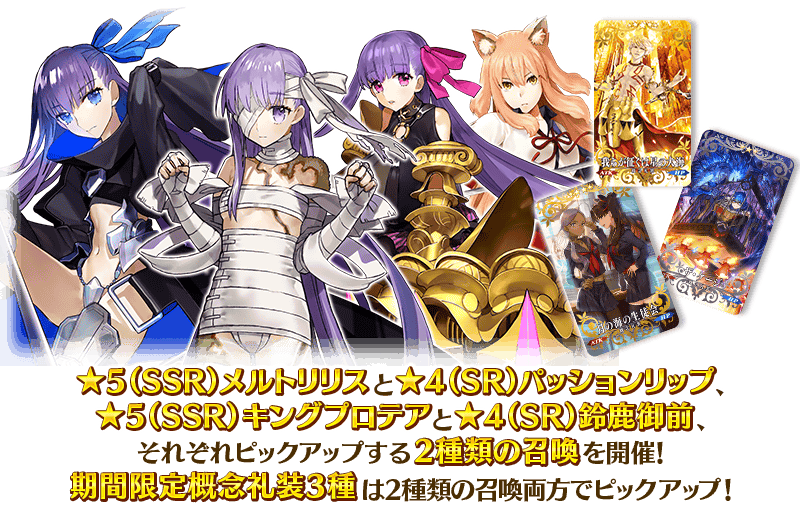 「メイン・インタールード 深海電脳楽土 SE.RA.PH」を、メインクエスト第1部 終局特異点クリアで無料開放した記念として、「★5(SSR)メルトリリス」「★5(SSR)キングプロテア」を含む4騎のサーヴァントと、2017年の「Fate/EXTRA CCCスペシャルイベントピックアップ召喚」で登場した期間限定概念礼装3種をピックアップする2種類の召喚を開催いたします!