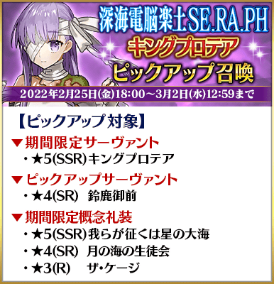 「メイン・インタールード 深海電脳楽土 SE.RA.PH」を、メインクエスト第1部 終局特異点クリアで無料開放した記念として、「★5(SSR)メルトリリス」「★5(SSR)キングプロテア」を含む4騎のサーヴァントと、2017年の「Fate/EXTRA CCCスペシャルイベントピックアップ召喚」で登場した期間限定概念礼装3種をピックアップする2種類の召喚を開催いたします!