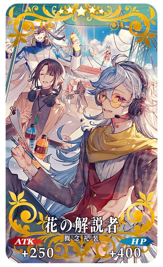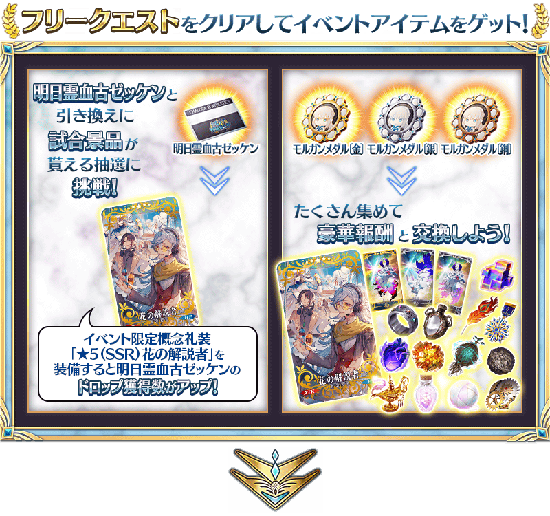 また、イベントアイテム交換で入手できるイベント限定概念礼装「★5(SSR)花の解説者」を装備することでイベントアイテム「明日霊血古ゼッケン」のドロップ獲得数がアップ!