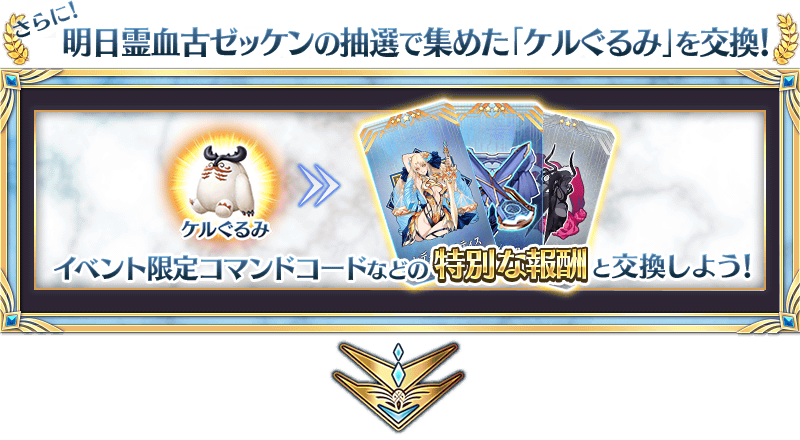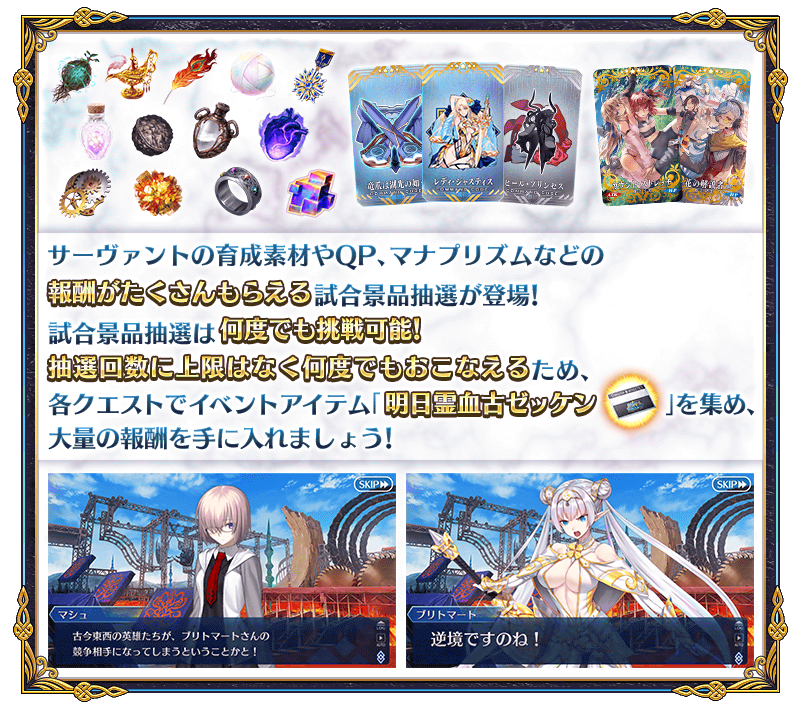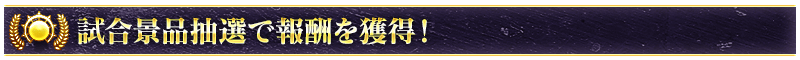 ※試合景品抽選の1回目~10回目では、「当たり」を引くことで「試合景品を更新」が表示されます。 ※11回目以降は、「試合景品を更新」は表示されず、すべての試合景品がなくなった時に自動的に次のラインナップに切り替わります。 ※11回目以降では、「当たり」および「黄金の果実」「白銀の果実」は更新されません。 ※試合景品にある「ケルぐるみ」は、集めることでイベント限定コマンドコードなど特別な報酬と交換できます。 ※交換期間終了後に「明日霊血古ゼッケン」は消滅します。