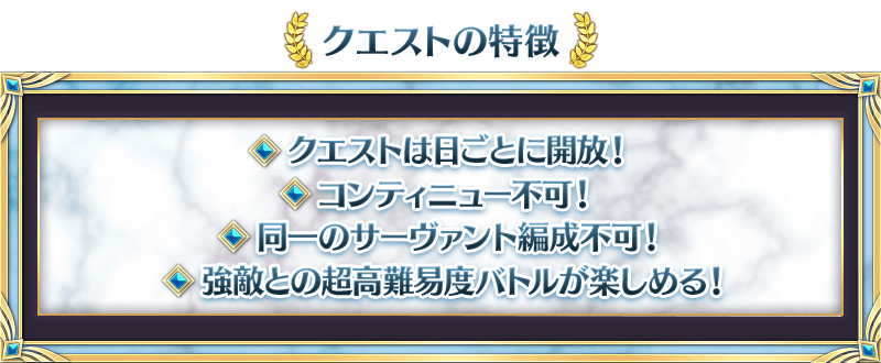 特殊なスキルの使用など通常とは違う攻撃パターンを持った敵に、コンティニュー不可の制限付きで挑む超高難易度クエストです。