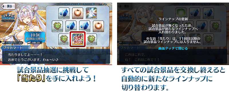 当たりを引き、「試合景品を更新」をタッチすると「当たり」が新たなものに入れ替わり、次のラインナップに切り替わります。