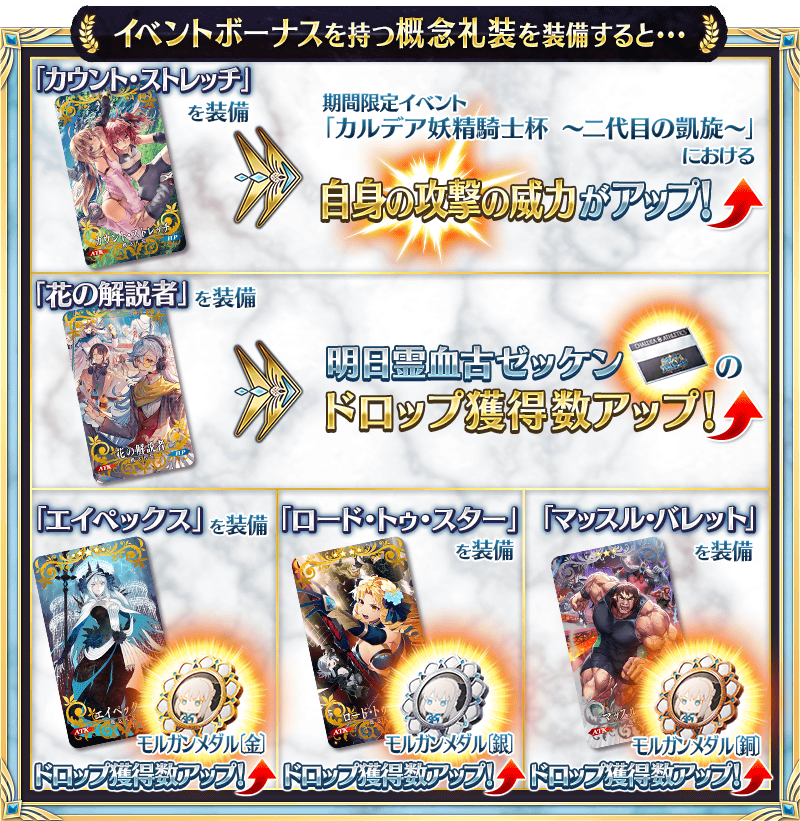 さらに、聖晶石召喚にてピックアップされる期間限定概念礼装「★5(SSR)エイペックス」「★4(SR)ロード・トゥ・スター」「★3(R)マッスル・バレット」を装備することで、イベントアイテム「モルガンメダル〔金〕」「モルガンメダル〔銀〕」「モルガンメダル〔銅〕」それぞれのドロップ獲得数がアップします。