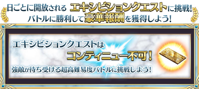 ※同名のサーヴァントでもレアリティかクラスが異なる場合や、名前に〔オルタ〕などと付く場合は編成可能です。 ※エキシビションクエストはクリア後も消滅せず、何度でも挑戦することが可能です。 ※クエストクリア報酬、戦利品、マスターEXP、魔術礼装EXP、絆ポイントを獲得できるのは初回クリア時のみです。