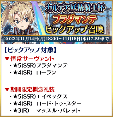 ※上記の「★5(SSR)ブラダマンテ」のイラストは霊基再臨第2段階のものです。