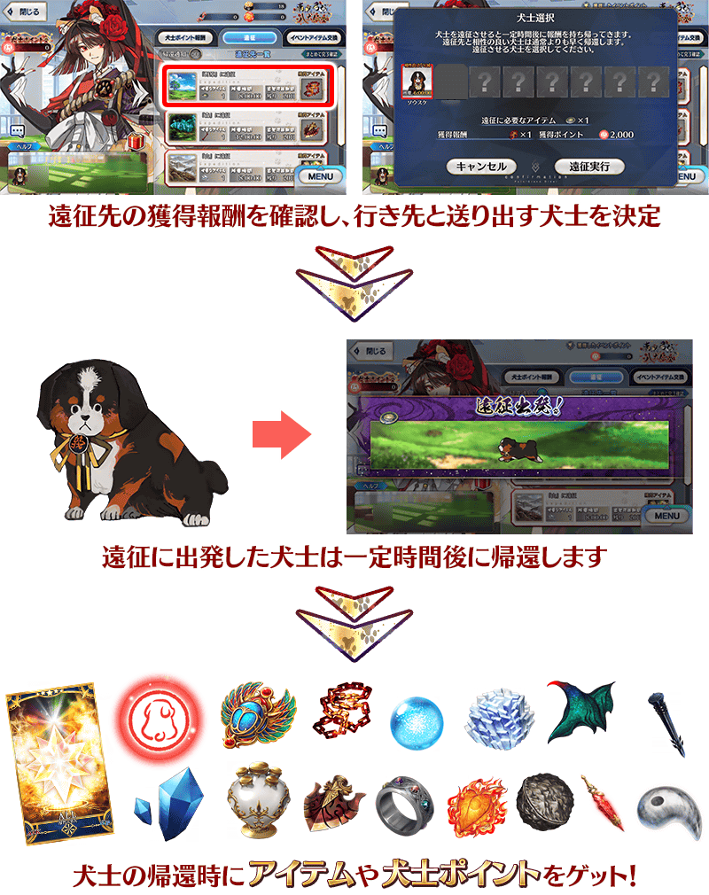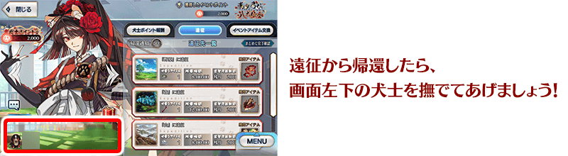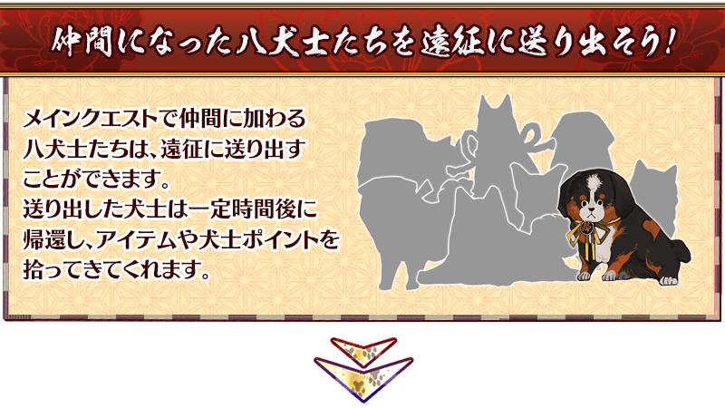 八犬士たちはアイテムを消費することで遠征に送り出すことができ、一定時間後に帰還します。帰還した犬士は遠征先からアイテムや犬士ポイントを拾ってきてくれます。